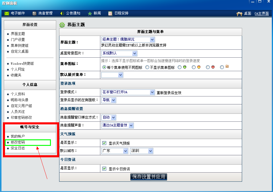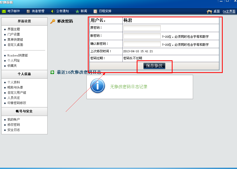 (4)OA地址(內(nèi)網(wǎng))修改成下面內(nèi)容[changanwuye.gicp.net:800]。用戶名首次登陸為自己的名字,沒有密碼。點(diǎn)擊保存。就可以直接登錄了。