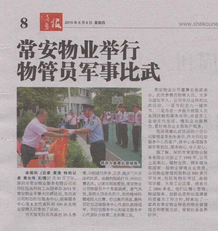 在2015年八一建軍節(jié)即將來臨之際,公司上下歡聚在百旺信高科技工業(yè)園,舉辦軍事隊列比武,一方面慶祝中國人民解放軍建軍88周年,另一方面向大家宣傳強身健體的觀念,同時向各位業(yè)主展示公司秩序維護隊伍的專業(yè)性和可靠性。每個服務中心代表隊都意氣風發(fā)、斗志昂揚,充分展示了自己的實力,收獲了屬于自己的榮譽。