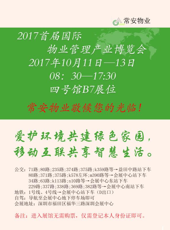 2017首屆國際物業(yè)管理產(chǎn)業(yè)博覽會于今日在深圳市會展中心舉辦,常安物業(yè)在此敬候您的光臨!?。?/span>