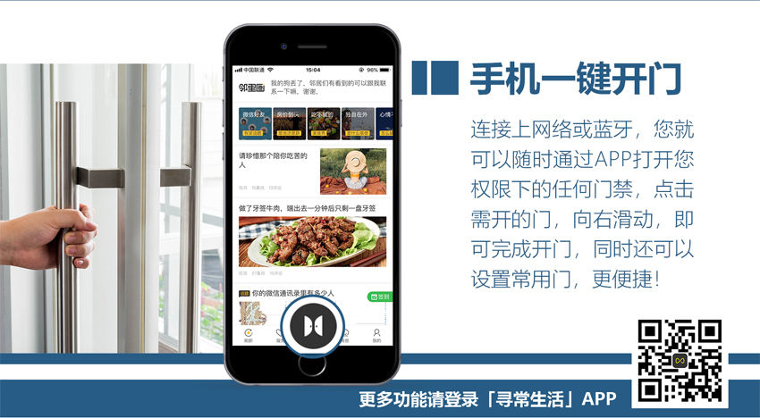 連接上網(wǎng)絡(luò)或藍(lán)牙,您就可以隨時通過APP打開您權(quán)限下的任何門禁,點(diǎn)擊需開的門,向右滑動,即可完成開門,同時還可以設(shè)置常用門,更便捷!